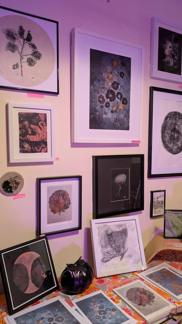 Reprint of original artwork. Mushroom spore prints on berry dyed paper. Eco printed on textured art paper