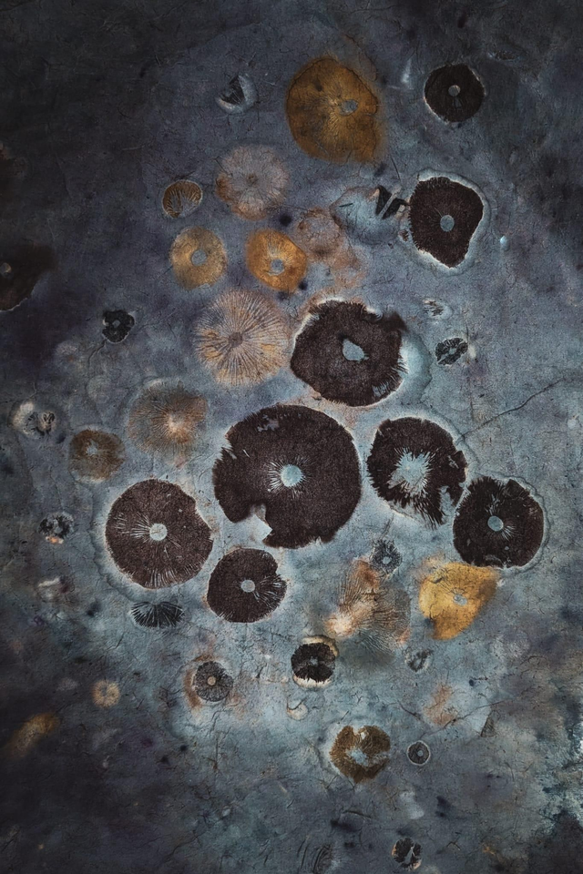 Reprint of original artwork. Mushroom spore prints on berry dyed paper. Misprint - colours less saturated on thin card